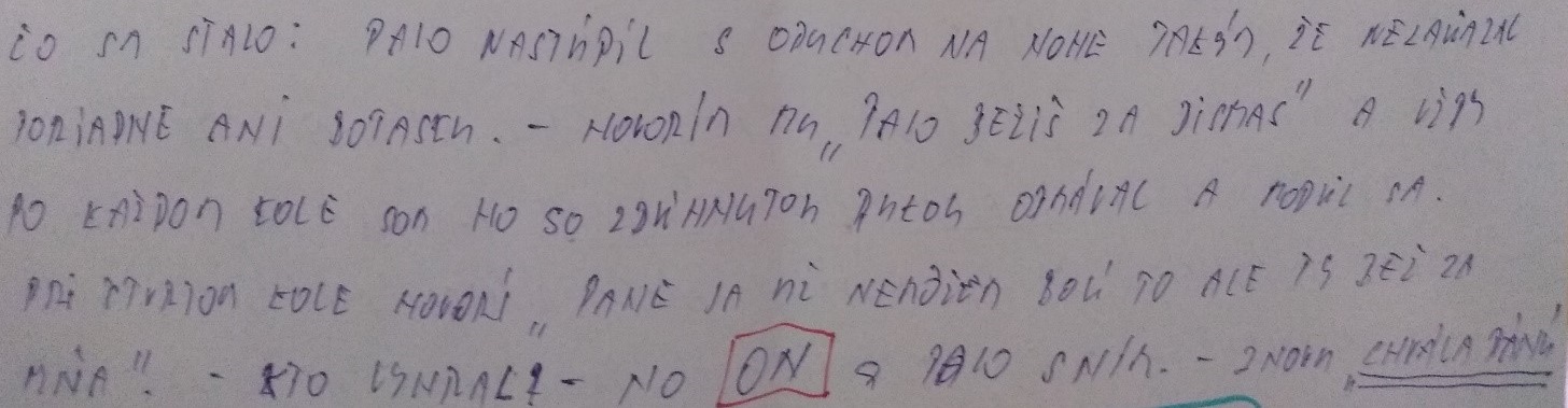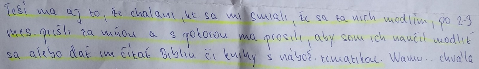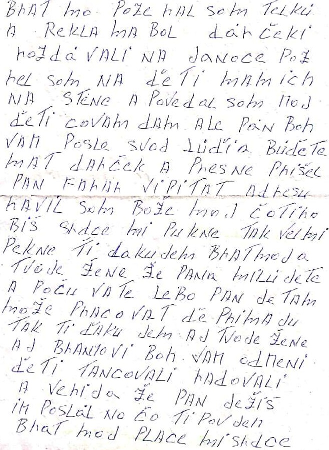 Znenie listu: “Pán pedagóg, viete čo sa mi stalo! Moja mama aj sestra mi písali, že som osprostel! Od viery a že kto ma to učí čítať Bibliu. Oni mi napísali, že v Biblii píšu sprostosti! A že nemám!!! čítať tu Bibliu, lebo ma vyhodia!!! z domu!!! Ale ja sa v živote!!! nevzdám!!! svojej viery, lebo ja milujem!!! Ježiša Krista!!! Nech si píšu, čo chcú! Ja za nášho Pána Boha dám aj život!!! Ale moja rodina si to nevie uvedomiť, že môžu moc ďakovať za všetko nášmu Bohu!