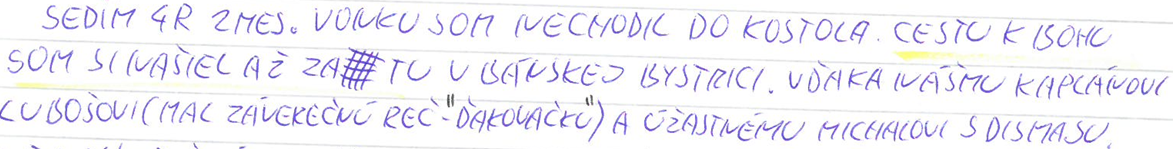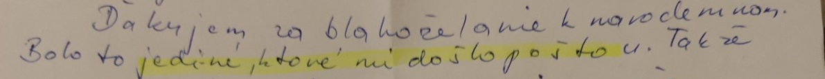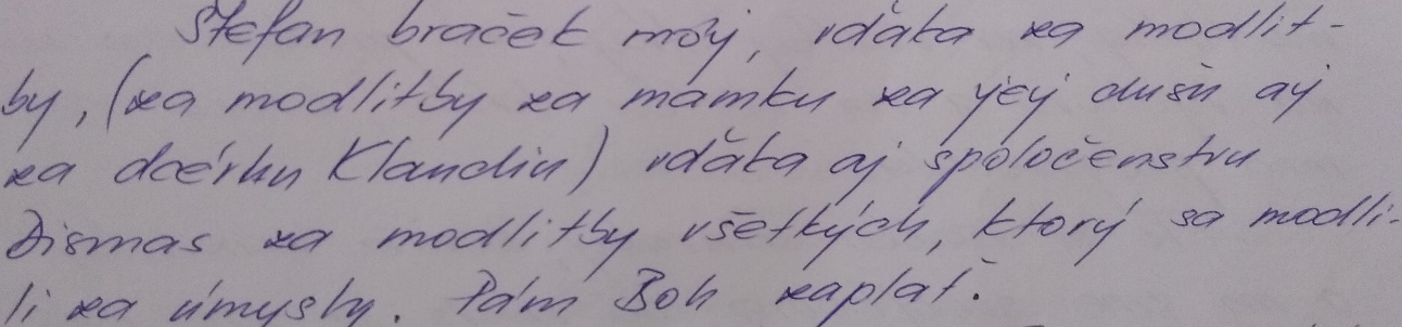 Znenie listu:“ Štefan, braček môj, vďaka za modlitby (za modlitbu za mamku, za jej dušu aj za dcérku Klaudiu), vďaka aj spoločenstvu Dismas za modlitby všetkých, ktorí sa modlili za úmysly. Pán Boh zaplať.“