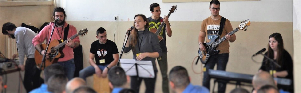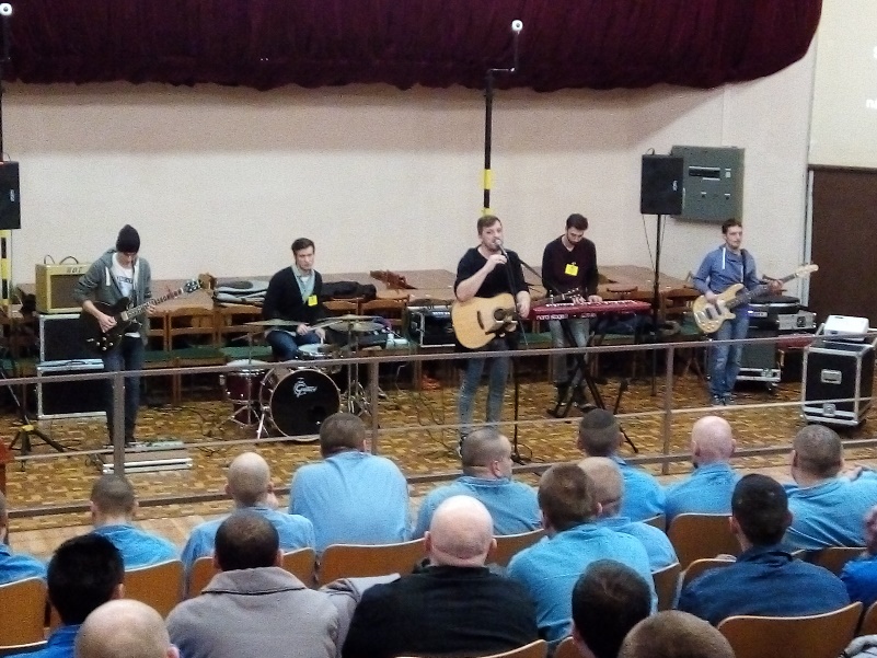 Fotka: ÚVTOS a ÚVV Leopoldov z modlitieb Chvál s kapelou ESPÉ dňa 7. 12. 2015 v kinosále ústavu za účasti cca 120 odsúdených a 23 obvinených.