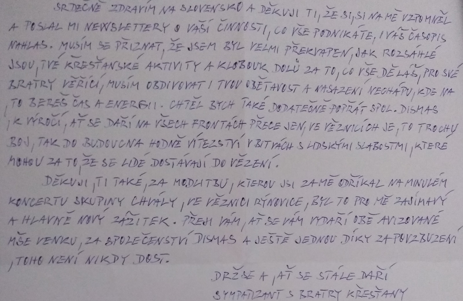 Znenie listu v slovenčine:“ Srdečne zdravím na Slovensko a ďakujem ti, že si si na mňa spomenul a poslal mi Newslettre s vašou činnosťou, čo všetko podnikáte i váš časopis Nahlas. Musím sa priznať, že som bol veľmi prekvapený aké rozsiahle sú tvoje kresťanské aktivity a klobúk dole za to, čo všetko robíš pre svojich bratov veriacich. Musím obdivovať i tvoju obetavosť a nasadenie. Nechápem, kde nato berieš energiu. Chcel by som taktiež dodatočne popriať spol. Dismas k výročiu. Nech sa darí na všetkých frontoch, predsa len vo väzniciach je to trochu iný boj. Tak do budúcnosti veľa víťazstiev v bitkách v ľudských slabostiach, ktoré môžu zato, že sa ľudia dostávajú do väzenia. Ďakujem ti taktiež za modlitbu, ktorú si za mňa odriekal na minulom koncerte skupiny Lámačské Chvály vo väzení v Rýnoviciach. Bol to pre mňa zaujímavý a hlavne nový zážitok. Prajem vám nech sa vydaria obidve avizované sväté omše vonku za spol. Dismas. A ešte raz ďakujem za povzbudenie, lebo toho nie je nikdy dosť. Drž sa a nech sa stále darí. Sympatizant s bratmi kresťanmi.“