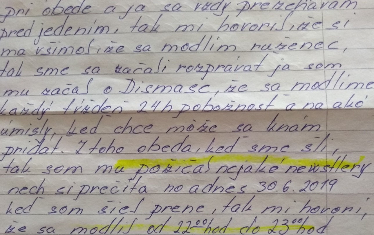 Znenie listu: “Pri obede mi jeden spoluodsúdený hovoril, že si ma všimol, ako sa vždy prežehnávam pred jedlom a že ma videl modliť sa ruženec. Tak sme sa začali hneď rozprávať. Ja som mu začal hovoriť o spol. Dismas, že sa modlíme každý týždeň 24-hodinovú pobožnosť a na aké úmysly, a že keď chce, tak sa k nám môže pridať. Z toho obeda keď sme šli, tak som mu požičal nejaké newslettery, nech si prečíta. No a dnes 30. 6. 2019, keď som si šiel pre ne, tak mi hovoril, že sa modlil od 22,00h. do 23,00h.“