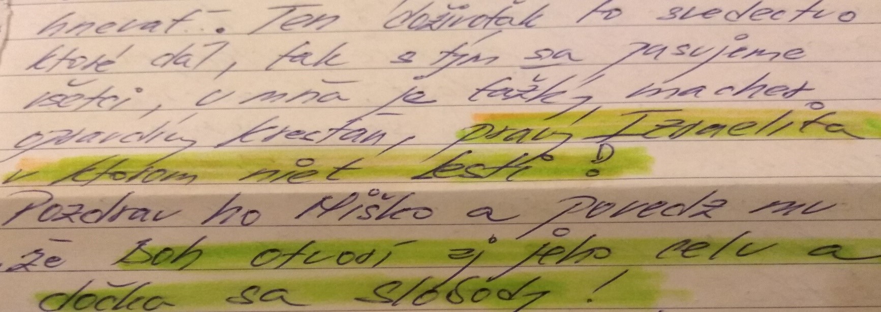 Fotka: časť listu od Janka, ktorý má syna v ČR a veľmi dlho ho nevidel a nemá o ňom v podstate žiadne správy, asi len to, že je nažive a zdravý. Preto chcel, aby sa jeho mama s ním aspoň raz osobne stretla na vlastné oči. No šampión (zlý) jej v tom vždy zabránil. Potom to už nechceli nechať na náhodu, tak vycestovala bez ohlásenia a ubytovala sa pri nich. Keď im búchala na dvere a neotvárali, vtedy mama s Jankom spolu volali. Janko bol z toho úplne na dne, bezradný, ale začal sa ešte viac modliť. A výsledok už viete sami. Stretli sa na druhý deň. Chvála Pánovi! Veď to je náš Ocko!