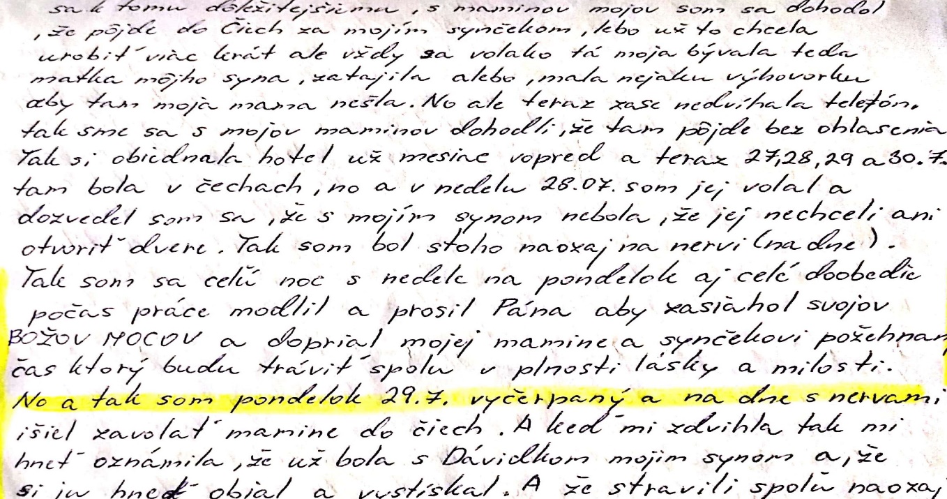 urobiť viackrát, ale vždy sa voľajako tá moja bývalá, teda matka môjho syna, zatajila alebo mala nejakú výhovorku, aby tam moja mama nešla. No, ale teraz zase nedvíhala telefón, tak sme sa s mojou maminou dohodli, že tam pôjde bez ohlásenia. Tak si objednala hotel už mesiac vopred a teraz 27., 28., 29. a 30. 7. tam bola v Čechách. No a v nedeľu 28. 7. som jej volal a dozvedel som sa, že s mojím synom nebola, že jej nechceli ani dvere otvoriť. Tak som bol z toho naozaj na nervy - na dne. Tak som sa celú noc z nedele na pondelok aj celé doobedie počas práce modlil a prosil Pána, aby zasiahol svojou Božou mocou a doprial mojej mamine a synčekovi požehnaný čas, ktorý budú tráviť spolu v plnosti lásky a milosti. No a tak som v pondelok 29. 7. vyčerpaný a na dne s nervami išiel zavolať mamine do Čiech. A keď mi zdvihla, tak mi hneď oznámila, že už bola s Dávidkom – mojím synom a že si ju hneď objal a vystískal. A že strávili spolu naozaj krásny čas.“