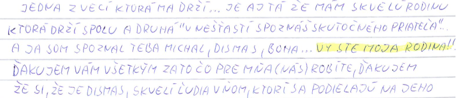 Fotka: časť z listu od Nora, kde taktiež píše, že sme jeho rodina. Ozaj nás to dojíma, keď nám takto niekto napíše. Celé znenie listu: „Jedna z vecí, ktorá ma drží....je aj tá, že mám skvelú rodinu, ktorá drží spolu a druhá „v nešťastí spoznáš skutočného priateľa“... A ja som spoznal teba Michal, Dismas, Boha...vy ste moja rodina!! Ďakujem Vám všetkým za to, čo pre mňa (nás) robíte, ďakujem, že si, že je Dismas, skvelí ľudia v ňom, ktorí sa podieľajú na jeho.....“.