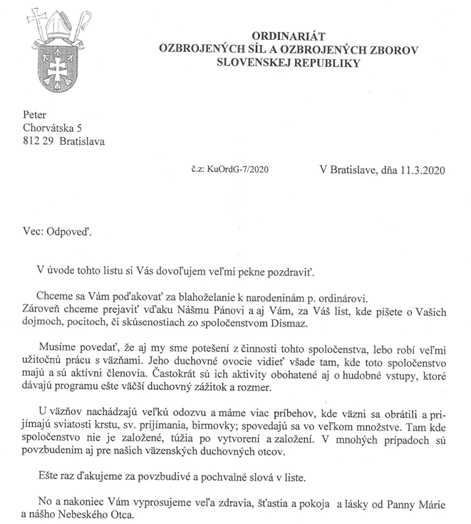Foto v ľavo: časť listu od Jožka z doživotných trestov v BB, v ktorom píše, že ďakuje za rúšku a že v nej vyzerá ako primár. Tak nás to rozosmialo, lebo je to pravda, a tak pekne jednoducho to napísal. Ešte jednu vec by som povedal, pred pár dňami som išiel cez vychádzkové dvorce a tiež člen spol. Dismas v Leopoldove , ktorý má doživotný trest, bol v tomto rúšku a ja som si uvedomil, že aj takto svedčí o divízii Dismas. Ešte ťa chcem požiadať prečítaj si celú knihu Sirachovu , ktorá sa nachádza vo svätom písme počas týchto sviatkov. Odpoveď na tvoju otázku, čo robiť: Dňa 29. marca 2020 boli všetci mnísi, z viac než 20 pravoslávnych kláštorov, ktoré sa nachádzajú na gréckom vrchu Athos (nazývanom tiež Svätá Hora) zjednotení v modlitbách počas 12 hodinovej vigílie (od súmraku do úsvitu). Počas vigílie sa Panna Mária zjavila jednému z mníchov a zanechala toto posolstvo pre všetkých kresťanov na pomoc, aby predišli zlu koronavírusu: Panna Mária povedala mníchovi: „Dajte Svätý Kríž na dvere vašich domovov. Ak nemáte Kríž, urobte si Kríž z dvoch kusov dreva alebo si vezmite svätený olej a na dvere s ním urobte znak kríža. Taktiež, dajte pomazanie na čelo všetkých členov rodiny sväteným olejom alebo olivovým olejom. (tento olej ti nemôžem poslať, ale v rohu listu, kde je spinka tam je nakvapkaný Nardový (Mk14,3-Jn12,3) a Charbelov olej). Ak máte svätenú vodu, pokropte ňou svoje cely/izby.