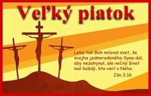 Veľký piatok(10.4.2020), - deň utrpenia, ukrižovania a smrti Ježiša Krista. V rímskokatolíckych chrámoch sa v tento deň neslúži svätá omša, oltáre sú bez chrámového rúcha. Všetci veriaci sa postia od mäsitých pokrmov a najesť sa možno za deň len raz do sýtosti. Je to deň osobitne zasvätený spomienke Ježišovho utrpenia a smrti na kríži. Je to deň pôstu, pokánia a jediný deň roka, kedy sa neslávi eucharistická obeta. Namiesto nej sa koná liturgia umučenia Pána, ktorá pozostáva z bohoslužby slova, slávnostnej modlitby veriacich, z poklony Svätému krížu a sv. prijímania. Ježišovu smrť nám pripomína aj liturgická farba - farba krvi. V tento deň sa čítajú alebo spievajú pašie.