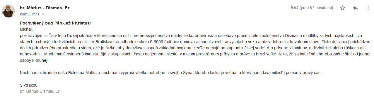 Aj ja sa denne presviedčam, že tieto tak ťažké dni nás ešte viac spájajú s našimi chudobnými i medzi sebou. Domov sv. Jána z Boha je otvorený. Naši chudobní žijú v sociálnej izolácii, ktorá sa touto situáciou u nich ešte prehlbuje, takže denne sme s nimi. Môžu sa u nás okúpať, prezliecť, oprať si veci, dostanú rúško, môžu si oddýchnuť, čím sa aj takto snažíme zmierňovať riziko šírenia epidémie. Mnohí majú na nás počas dňa otázky „Prečo?“, mnohí majú strach z neistoty „Čo bude ďalej?“ a niektorí v očiach aj slzy... Spolu hľadáme odpovede cez duchovné prostriedky karantény, najmä cez pokánie a spoločnú modlitbu, ktorá posilňuje našu solidaritu a najmä nádej. To, čo sa okolo nás deje a čo sa k nám cez média dostane z Talianska alebo Španielska, je strašné a ťažko sa hľadajú vhodné slová..., no určite tu chcem povedať, že toto nie je Božím trestom, ale výsledkom života bez Boha! Akoby sme každým neoľutovaným hriechom otvorili priestor tejto pandémii. Prestali sme si vážiť najmenších, starých a chorých, nemali sme pekné slovo pre zdravotníkov a policajtov, neustále sme spochybňovali hodnotu tradičnej rodiny, ničili sme prírodu, voľný čas sme trávili v nákupných centrách, mysliac si, že si môžeme všetko kúpiť... Tento nespútaný materializmus a konzum nám poriadne pokrivil hodnoty! Vzdialili sme sa od Boha a na Jeho miesto sme dali seba samého. Odsunuli sme nášho dobrého Boha do úzadia., vyhnali sme Ho zo škôl, z rodín, z práce, zo spoločenstiev..., tak potom Mu nemôžeme vyčítať, prečo nás neochránil a niečo takéto dopustil! Boh nie je proti nám! Je s nami, za nás, ale plne rešpektuje slobodu, ktorú nám dal, teda aj vôľu odkloniť sa od Neho, ísť proti Nemu! Táto pandémia nás ale môže, tak veľa naučiť! Zahnala nás domov, z ulíc do rodín a to je príležitosť aj na cestu zvonku do vnútra, z povrchného života do vlastného vnútra, kde v hĺbke prebýva Boh. S Ním sme schopní pochopiť aj krehkosť a zraniteľnosť, ktorú teraz prežívame, no najmä to, že Boh zostáva navždy s nami. Jeho milosrdenstvo trvá naveky a Kristov kríž je pre nás pevným bodom aj uprostred takejto situácie okolo nás a vo svete. Teraz je pre nás čas skúšky, ale aj čas milosti., možnosť prejsť cez utrpenie, očistiť sa a začať odznova a lepšie. Aj ja sa na mnohé veci pozerám inak a viac sa modlím, prosiac o milosť byť ako pustovník v meste viac "postavený do trhliny", ako o tom hovorí *Ezechiel 22,30, a takto pracovať a modlitbou vstupovať do Božieho mlčania pre dobro bratov a sestier a samozrejme aj spoločenstva Dismas. Teší ma, že tak vo veľkom vidieť mnohé srdcia otvorené pre potreby slabých a najbiednejších. Avšak, nielen slabí teraz potrebujú nás silných, ale aj my silní potrebujeme slabých, ich modlitby a obetované utrpenie. Ďakujem Ti za modlitby, aj za všetku pomoc a prosím, aby sme teraz viac pamätali aj na ľudí bez domova. Možno sú nám na pohľad nepríjemný, možno k nim máme odpor, ale veľmi nás potrebujú. Aj v nich môžeme stretnúť Boha, "syna človeka, ktorý nemá kde hlavu skloniť..."