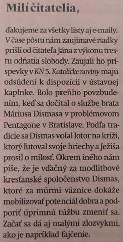 Foto: Katolícke noviny č.13 strana 15. tak na tento príspevok nás upozornil Janko z Leopoldova, ktorý si ho všimol a napísal nám o tom. Ako vieš, tak sme mali misiu ohľadne písania a povzbudzovania pre Katolícke noviny a veľa z vás, ktorí túto misiu splnili, tak mi napísala, že im neodpísali. A tak, aby sme žili v pravde treba povedať, že to spomenuli v tomto čísle a ak budete mať viac informácii, resp. bude sa niečo niekde písať, alebo počuť o spol. Dismas napíš, tak ako Janko, aby sme dali vedieť aj ostatným bratom a sestrám na povzbudenie.