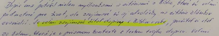 Foto: časť listu od Jozefa z Prešova, ktorý sa zdôveril ako číta listy, ktoré dostáva od nás. V jeden ruke NL a v druhej ruke sväté písmo. Ďakujem Jožko, že si správne pochopil celý zámer NL a verím, že aj ostatný členovia majú pri sebe sv. písmo a čítajú takýmto spôsobom NL a všetku dostupnú kresťanskú literatúru. Nie rýchlo, ale s Duchom svätým.