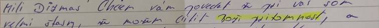 Foto: časť listu od Janka z Leopoldova, ktorý reagoval na korešpondenciu od spol. Dismas. Sme veľmi radi, že aj maličké úsilie robené s láskou spôsobuje radosť vo vašich srdciach. Tento projekt nie je náš ani náhodou, ale Ockov.