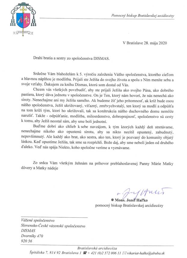 Foto: list od pomocného biskupa Bratislavskej Arcidiecézy Mons. Jozefa Haľka, ktorý nás povzbudzuje na ceste.