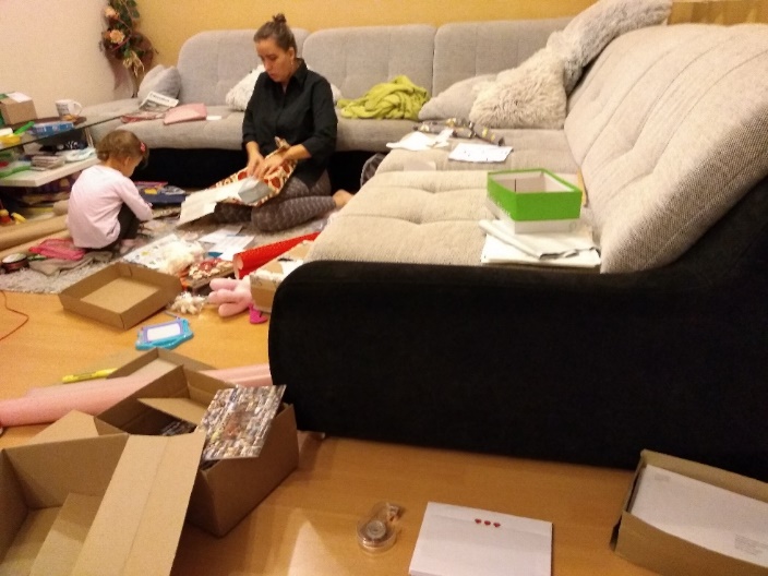 Fotka: manželka Mirka s členkou spol. Dismas Luckou do polnoci balili darčeky, aby detičkám prišli včas, nakoľko nás to napadlo až v decembri 2018 a je to trošku zložitejšie, než to na prvý pohľad vyzerá.