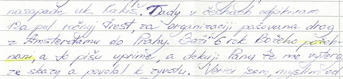 Fotka: časť listu od odsúdeného z Plzne, kde píše, že „tady v Čechách odpykávam 12 a pol ročný trest, za organizovanie pašovania drog z Amsterdamu do Prahy. Beží 6 rok Božieho požehnania a to píšem úprimne a ďakujem Pánu, že ma vytrhol zo skazy a povolal k životu.“