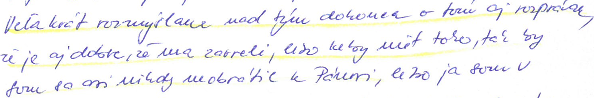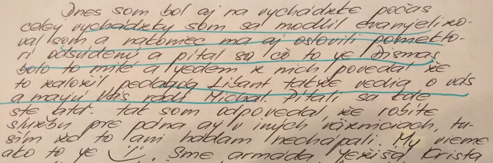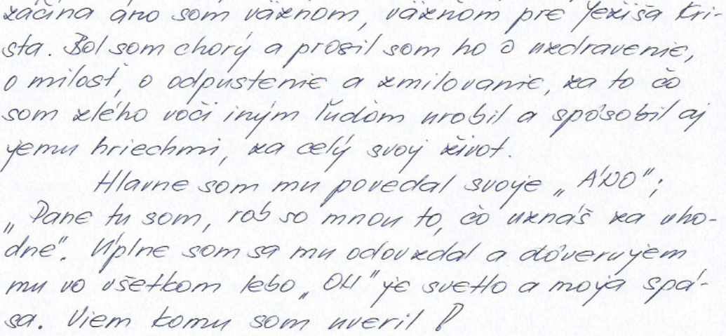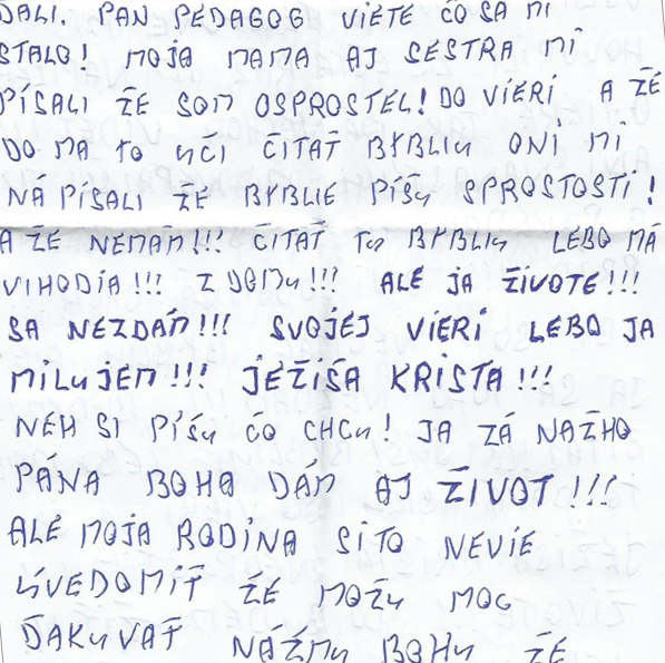 Znenie listu: “Pán pedagóg, viete čo sa mi stalo! Moja mama aj sestra mi písali, že som osprostel! Od viery a že kto ma to učí čítať Bibliu. Oni mi napísali, že v Biblii píšu sprostosti! A že nemám!!! čítať tu Bibliu, lebo ma vyhodia!!! z domu!!! Ale ja sa v živote!!! nevzdám!!! svojej viery, lebo ja milujem!!! Ježiša Krista!!! Nech si píšu, čo chcú! Ja za nášho Pána Boha dám aj život!!! Ale moja rodina si to nevie uvedomiť, že môžu moc ďakovať za všetko nášmu Bohu!