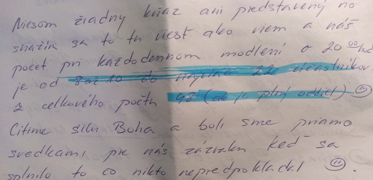 „Nie som žiadny kňaz ani predstavený, no snažím sa to tu viesť a náš počet pri každodennom modlení o 20.00 hod. je od 8-10 do najviac 22 účastníkov z celkového počtu 48 (ak je plný oddiel).