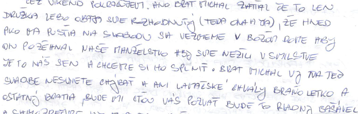 Znenie listu: „Cez víkend mu poďakujem. Áno, brat Michal, zatiaľ je to len moja družka, lebo obaja sme rozhodnutí (teda ona aj ja), že hneď ako ma pustia na slobodu, sa vezmeme v Božom dome, aby On požehnal naše manželstvo, aby sme nežili v smilstve. Je to náš sen a chceme si ho splniť. Brat Michal, vy na tej svadbe nesmiete chýbať a ani Lámačské chvály a Braňo Letko aj ostatní bratia. Bude mi cťou vás pozvať. Bude to bašável.“