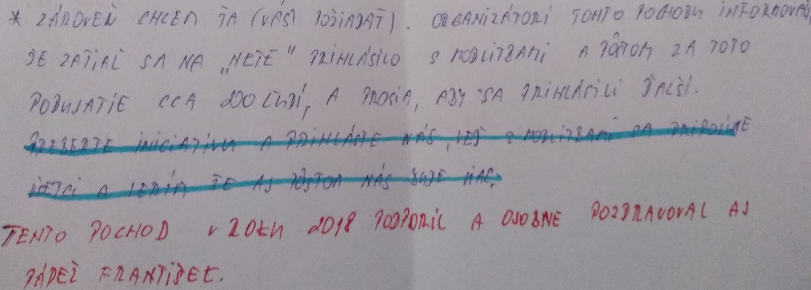 Znenie listu:“ Zároveň chcem ťa (Vás) požiadať o informovanie organizátorov tohto pochodu, že zatiaľ sa za nich a celý pochod prihlásili s modlitbami a pôstom cca 200 ľudí. A prosia, aby sa prihlásili ďalší. Preberte iniciatívu a prihláste nás, veď s modlitbami sa pripájame všetci a verím, že aj pôstom nás bude viac.