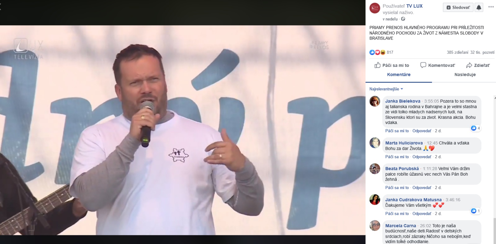 Fotka: svedectvo o Dismase na Pochode za život v Bratislave dňa 22. 9. 2019 počas priameho prenosu TV LUX na Facebooku. V ktorom som tiež spomenul, že odsúdení sa každý deň modlili a postili za túto akciu a povedal som aj svedectvo o mamičke. Pochodu za život sa vtedy zúčastnilo až 50 000 ľudí.