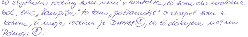 Celé znenie listu: „So zbytkom rodiny som neni v kontakte, čo som donedávna bol, lebo „šampión“ to tam „pošramotil“ a dospel som k záveru, že moja rodina je DISMAS, za čo ďakujem nášmu Pánovi.