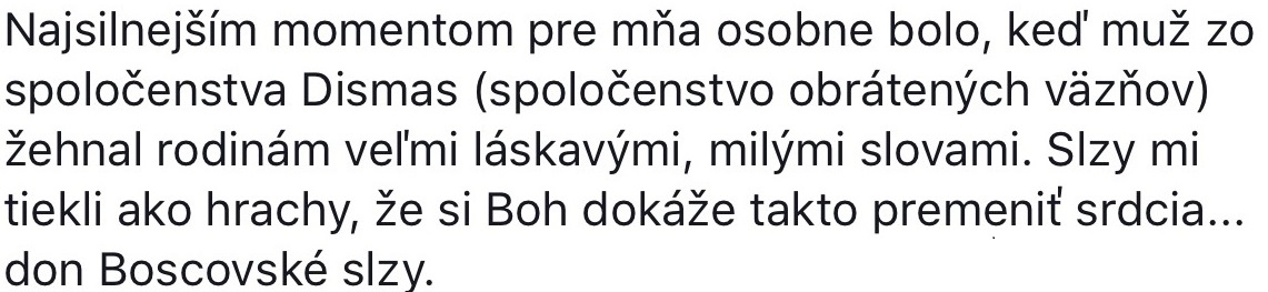 Môžem vám povedať, že toto mi teraz pravidelne hovoria ďalší odsúdení. Ďalším odsúdeným toto svedčím a oni prichádzajú a hovoria: „Aj my to tu máme a ďakujeme Bohu. Neviem prečo sme tu vo väzení, ale keď to malo byť kvôli tomuto, tak som rád, lebo Boh všetko negatívne, všetko zlé, aj to najhoršie zlo obráti v náš prospech. On je dobrý Ocko, On nás miluje a všetko, čo robíme, chceme robiť na Božiu slávu.“