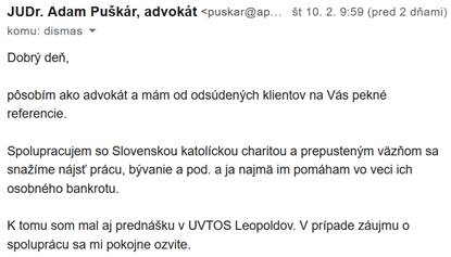 Ďakujem. A odpoveď prišla (viď obrázok mailu od právnika Puškára). Tak som Janke poslal na neho telefónny kontakt a verím, že sa mu ozve a vyrieši sa ich ťažká životná situácia.