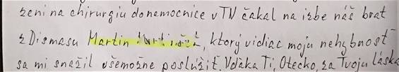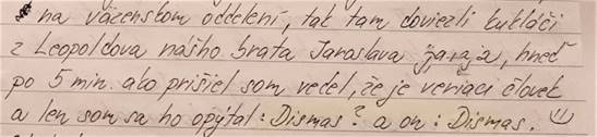 Foto: časť listu od Jaroslava z väznice Leopoldov, aktuálne z väznice-nemocnice v Trenčíne: „Sláva Bohu a Nepoškvrnenej! Drahý brat Michal! Úvodom prijmi odo mňa srdečný pozdrav Ty, Tvoja rodinka a tiež pozdravujem brata Maroša a všetkým vám posielam po svojom strážnom anjelikovi krížik. Veľmi pekne Ti ďakujem za Tvoj povzbudivý list a za NL. Omylom si mi ho poslal dupľovane a tak budem môcť poslať jeden priateľke Marienke do B.B., ktorá sa za mňa a za celé naše spoločenstvo modlí. To je tá milá 86 ročná pani na vozíku, ktorej fotku si voľakedy získal niekde v Piešťanoch a si mi ju poslal. Zabudol som Ti povedať - napísať - že moje svedectvo o Oteckovej láskavej starostlivosti, keď ma 19. januára po privezení na chirurgiu do nemocnice v TN čakal na izbe náš brat z Dismasu Martin ......., ktorý vidiac moju nehybnosť sa mi snažil všemožne poslúžiť. Vďaka Ti, Otecko, za Tvoju láskavú starostlivosť!“