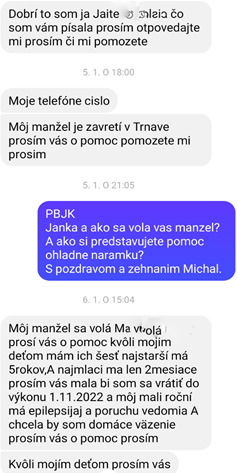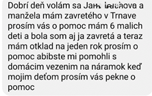 Ako už viete, často nám prichádzajú rôzne žiadosti, prosby o modlitby a aj pomoc. Preto by som sa chcel s jednou takouto prosbou o pomoc zdôveriť. Písala jedna žena matka 6 detí (viď foto), ktorá má manžela zavretého v Hrnčiarovciach a nakoľko je s nami v spol. DISMAS, tak sme sa snažili pomôcť. K tejto pomoci píše aj Jožko Štrbavý, člen spol. DISAMS (viď foto), ktorý bol 14 rokov vo výkone trestu v Leopoldove a teraz je tomu už skoro 5 rokov, čo je na slobode: „Michal ma poprosil, či by som mohol odviezť nejaké veci jednej pani, ktorá má viac detí, býva vo Vinodole pri Nitre a manžela má zatvoreného vo výkone trestu. V nedeľu 13. 2. som išiel na sv. omšu do Hlohovca, ktorú slúžil pán kaplán.
